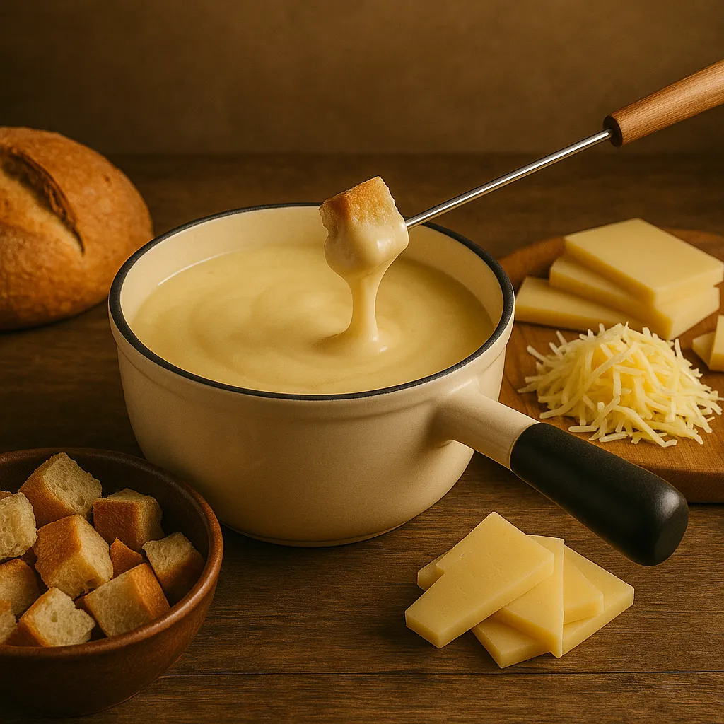 La fondue de queso es una receta tradicional de origen alpino, donde el queso se funde lentamente con vino blanco y ajo hasta lograr una crema uniforme y aromática.